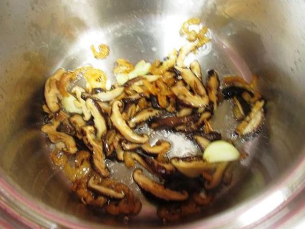 (3) 加入香菇丝炒香,去掉生味。