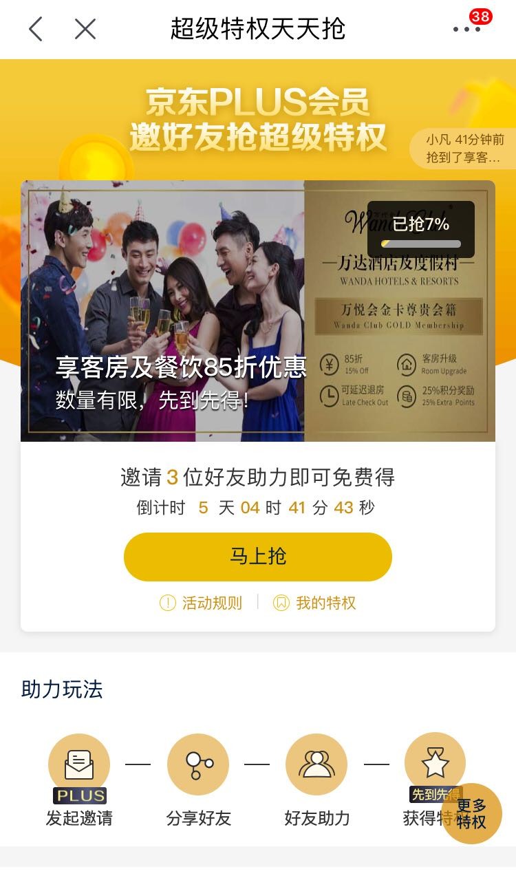 对于京东PLUS会员而言领取也非常简单,消费者只需要在京东APP中点击"我的",进入PLUS会员页面后,即可在PLUS生活特权里找到"万达酒店及度假村"活动,然后邀请3名好友助力即可获得一张"万悦会金卡",随后通过"万达酒店及度假村"微信公众号激活会员卡后即可使用。当然,此次免费领取的"万悦会金卡"也是限量抢,先到先得。