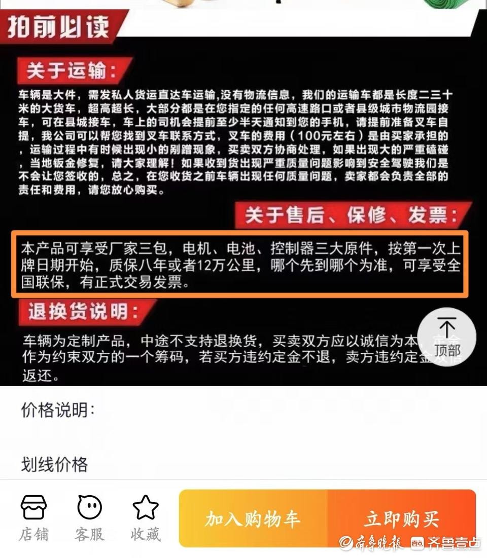 梁先生提供的截图显示,该车的销售页面确实有关于质保的备注,“本产品可享受厂家三包,电机、电池、控制器三大原件,按第一次上牌日期开始,质保八年或者12万公里,哪个先到哪个为准,可享受全国联保”。既然梁先生的车还在质保期内,出了故障厂家能不能负责维修呢?