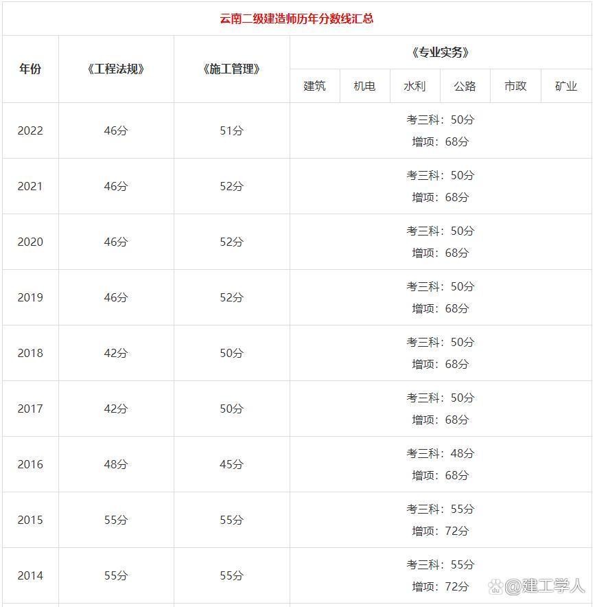 2022云南二建合格线,近几年云南二建分数线,历年合格分数线对比
