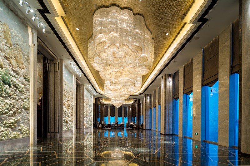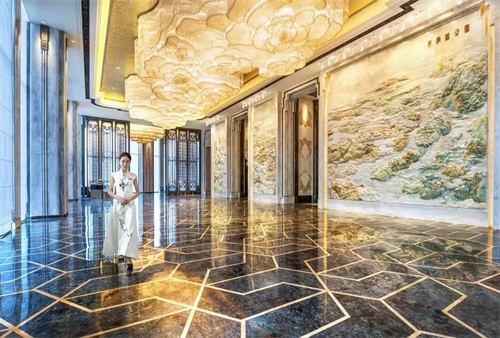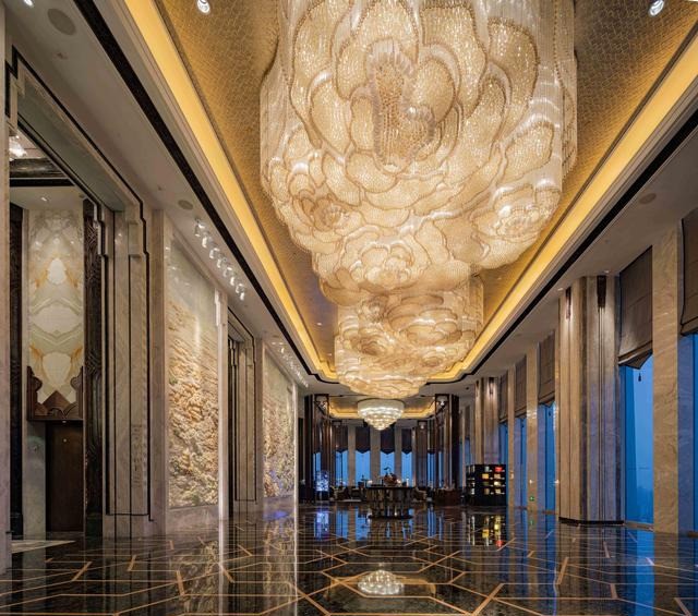 酒店大堂地面的大理石分割方式由“千古之谜”的三星堆青铜器图案中提炼而成,与恢宏大气的“天府盛景图”遥相呼应,仿佛穿越时空的文明对话。雍容华贵的芙蓉花作为大堂主灯,灵动而又有气势,展现高贵典雅的美感。