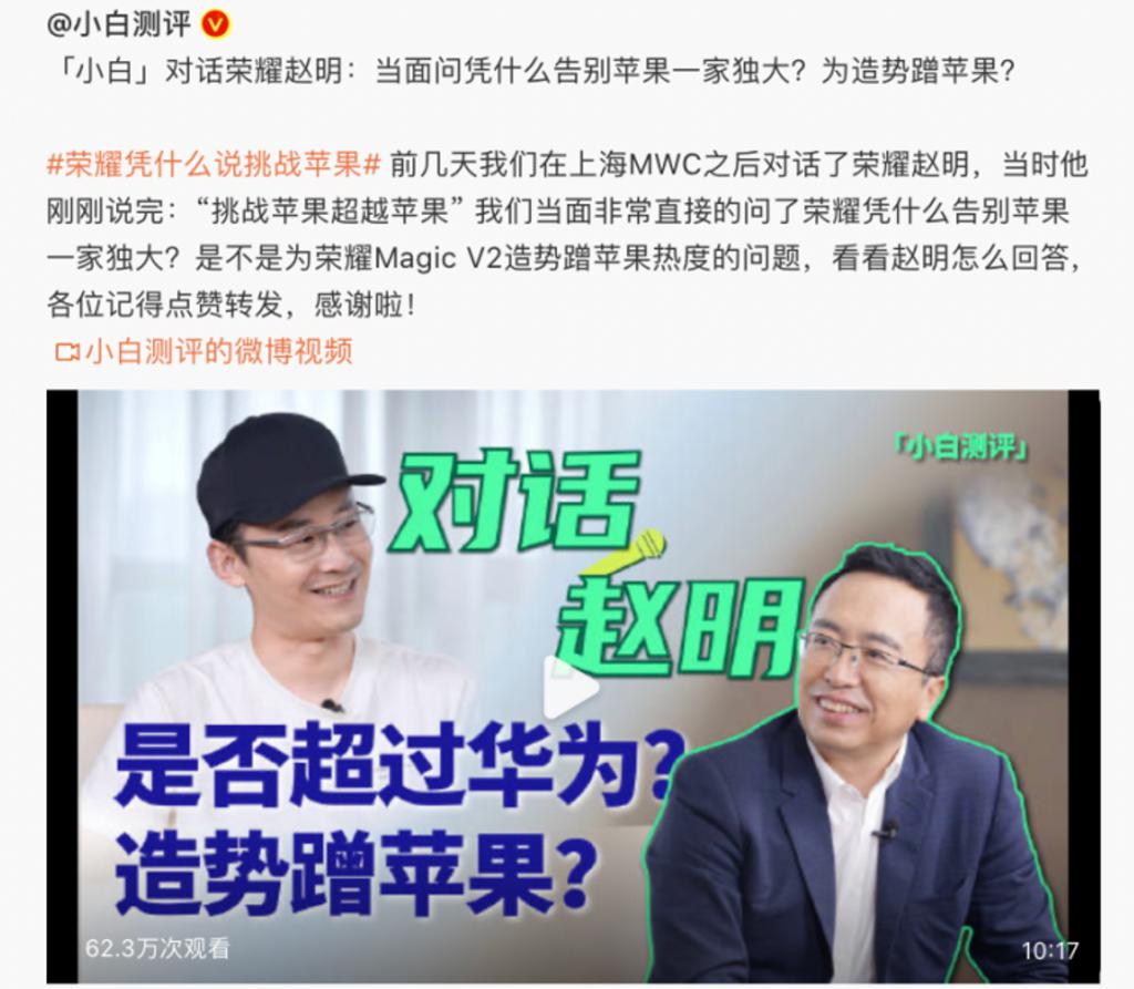 于是小白也在视频中问到,荣耀说挑战苹果或者超越苹果,是否是在为新产品造势,蹭热度,是否真的很有信心以这款新的折叠产品挑战苹果。对此赵总也毫不掩饰的回应,荣耀有着非常强大的自信,始终相信先有挑战者,才会有挑战成功者,并进一步表示目前荣耀已经在很多方面超越苹果了。