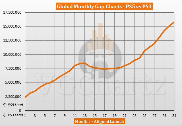 2023 年 5 月是 PlayStation 5 上市的第 31 个月。相比较 PS3 上市第 31 个月,差距进一步扩大到 68 万台。