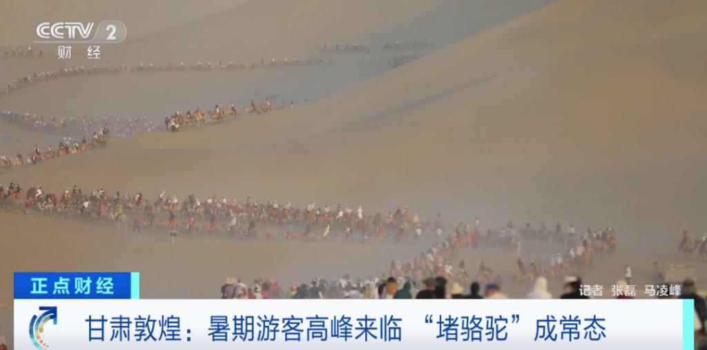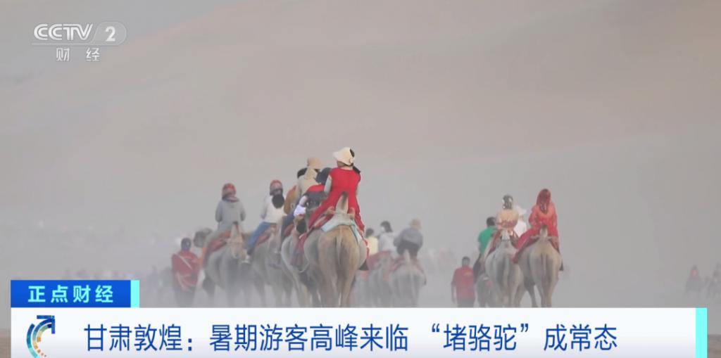 记者在敦煌的鸣沙山月牙泉景区看到,随着暑期到来,当地的旅游人数也在不断攀升。游客骑着骆驼,沿着鸣沙山脚下穿行,场面显得十分壮观。