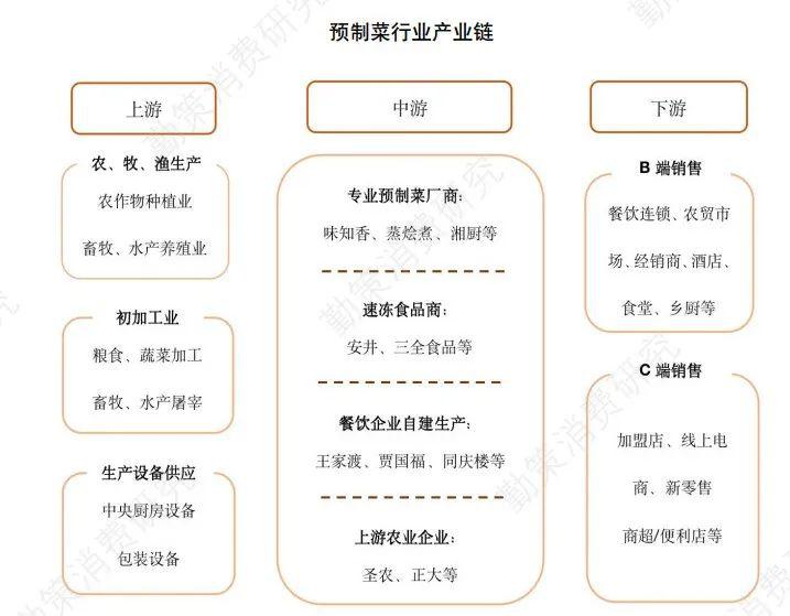 在产业下游,据亿欧数据,中国预制菜市场的 B、C 端市场份额占比是 8:2。但因目前我国餐饮行业 CR5 市占率为 2%,市场集中度偏低。相对分散的市场也意味着预制菜企业拓展 B 端客户难度增加。