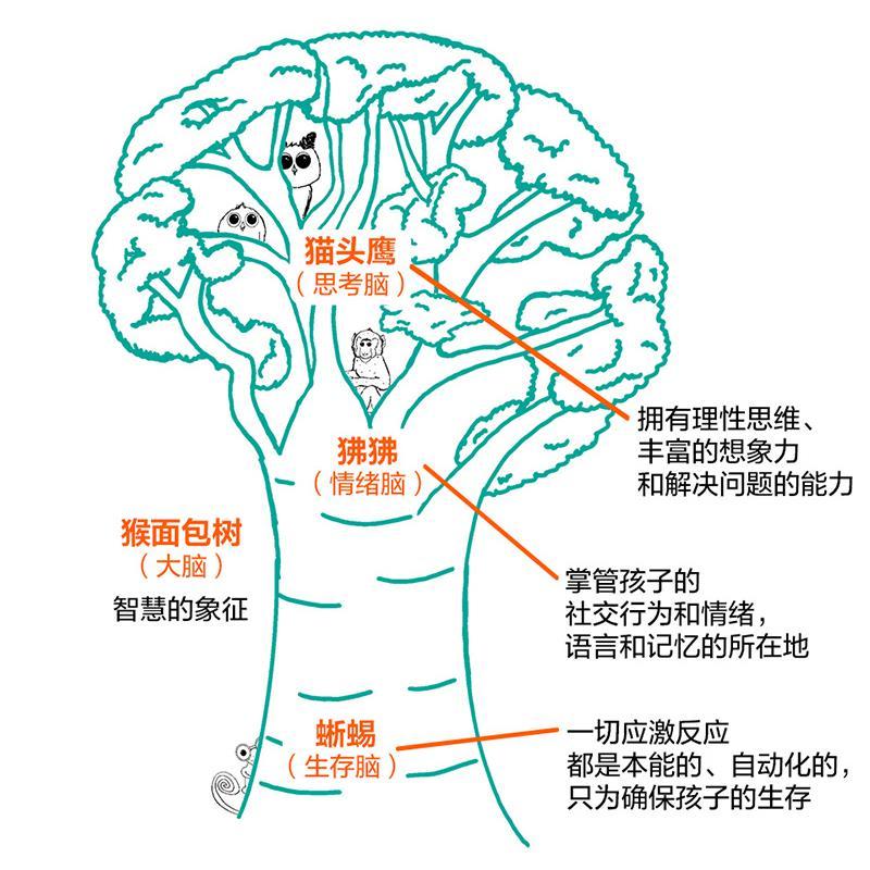 猴面包树不是一棵普通的树。它是生长在津巴布韦的一棵古老的猴面包树,也是智慧的象征。作者把它比作孩子的大脑。书中简单明了地提炼了大脑的不同角色。一种是蜥蜴(生存脑),一切应激反应都是本能的、自动化的,只为确保孩子的生存;一种是狒狒(情绪脑),掌管孩子的社交行为和情绪,语言和记忆的所在地;一种是聪明的猫头鹰(思考脑),拥有理性思维、丰富的想象力和解决问题的能力。