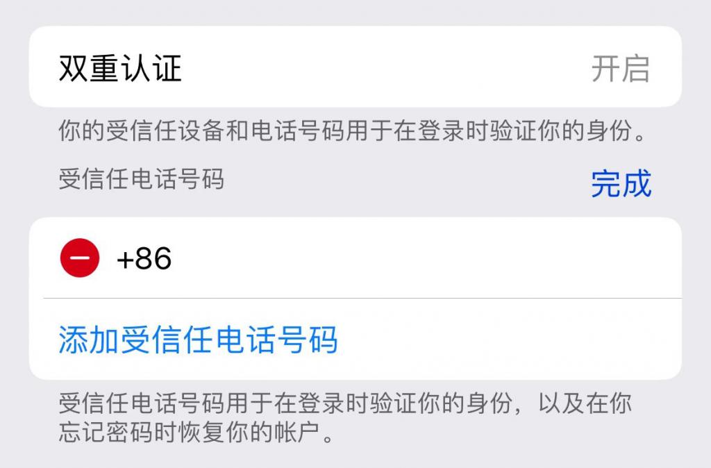 有了 Apple ID 的账号密码后,就能添加 " 受信任电话号码 " 。