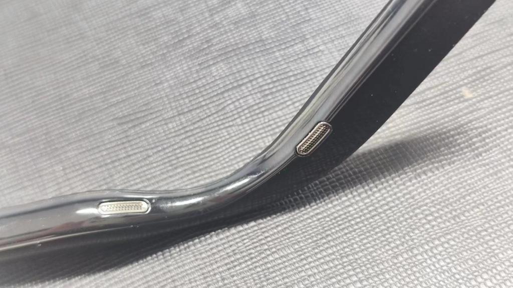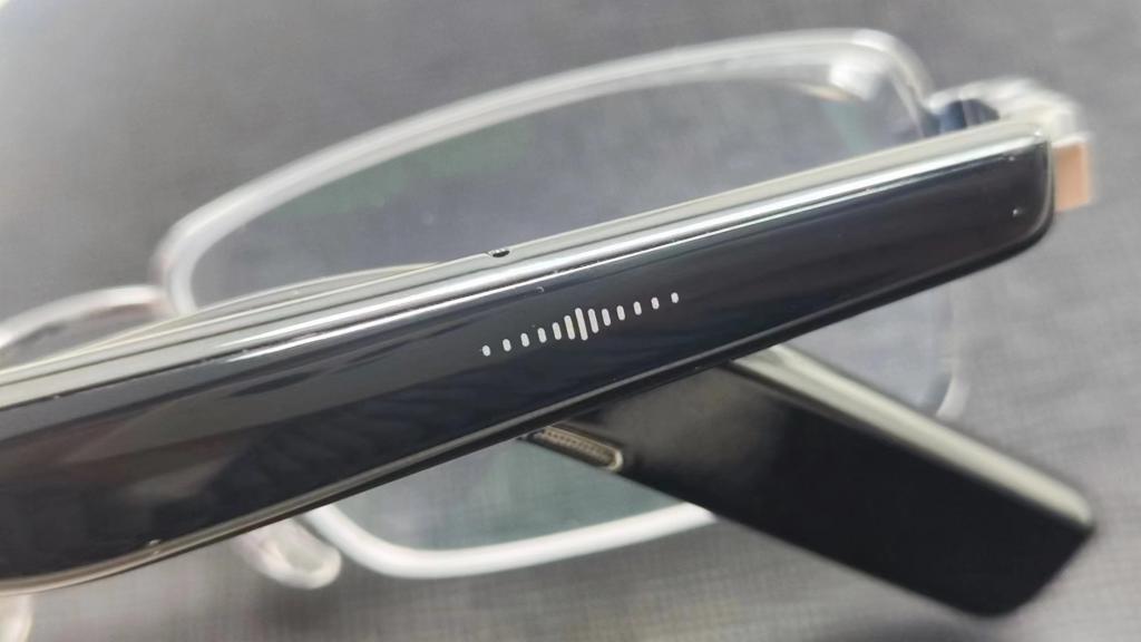 镜腿后侧有扬声器开孔,单只镜腿搭载了两颗扬声器单元,组成了这款产品的主要卖点——四扬声器阵列。
