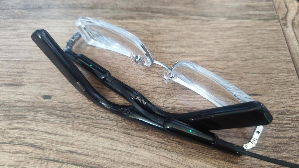 因为这款产品的镜腿和镜框是可以分离的,因此充电的时候需要给两条腿都连接上,就像图中这样: