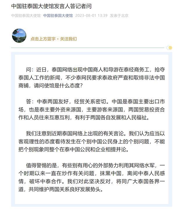 8 月 1 日," 中国驻泰国大使馆 " 微信公众号发布《中国驻泰国大使馆发言人答记者问》: