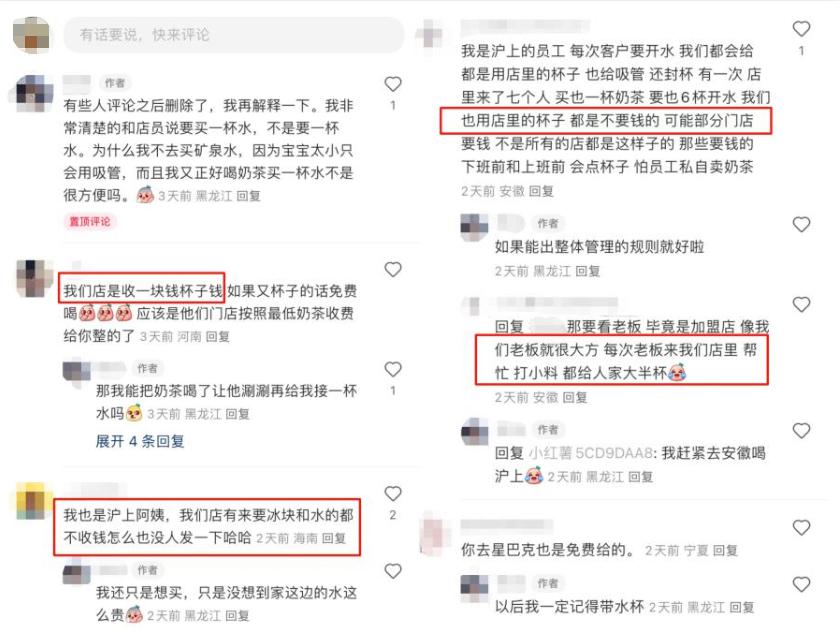 热搜中的涉事门店解释称:公司规定不能单独销售杯子,消费者如果只要一杯白开水,就必须收一杯奶茶钱。但笔者在其他社交平台发现,同样是沪上阿姨旗下门店,部分门店在消费者需要白开水或冰块时没有收取杯子费用,或者只收取一元。