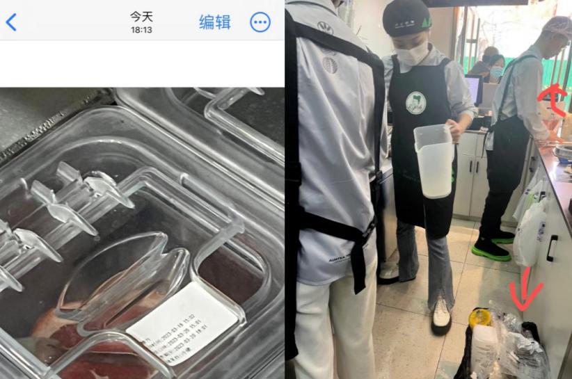左:小料过期 右:店员未戴口罩,操作台下为敞盖垃圾桶 图源:新浪科技