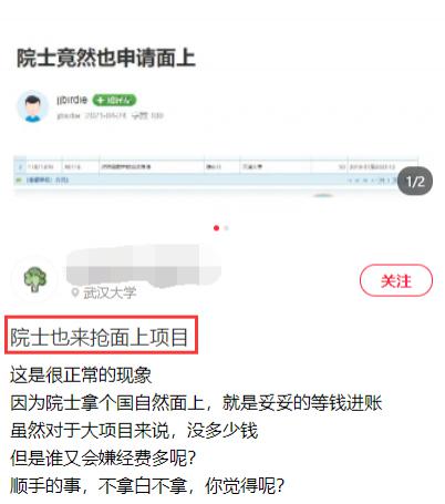 根据小红书上的截图,在小木虫论坛,有人发帖称在面上项目那见到了院士的名字。