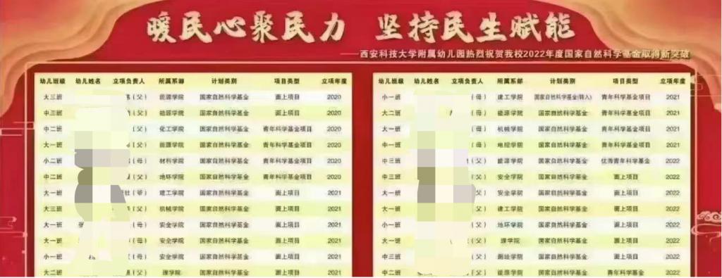 甚至还有高校的附属幼儿园,在幼儿园放榜时,张贴出了幼儿园小朋友的父母获得国自然资助的情况。