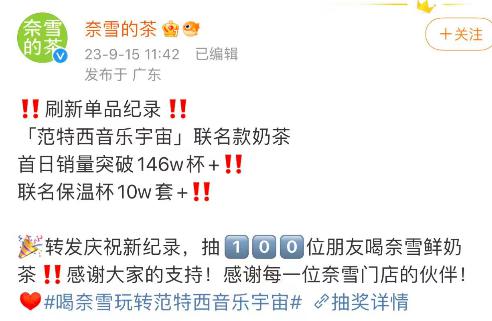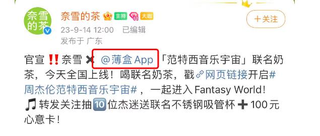 9 月 14 日午间,奈雪的茶官宣与薄盒 APP 推出 " 范特西音乐宇宙 " 联名奶茶。