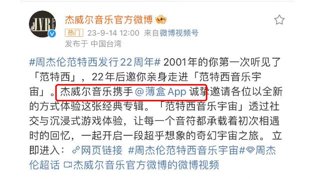 9 月 14 日,薄盒与杰威尔同时宣布携手推出周杰伦专辑《范特西》IP 的数字藏品版本,薄盒将其称为 " 范特西音乐宇宙 ",而这天也正好是周杰伦《范特西》专辑发行 22 周年的日子。