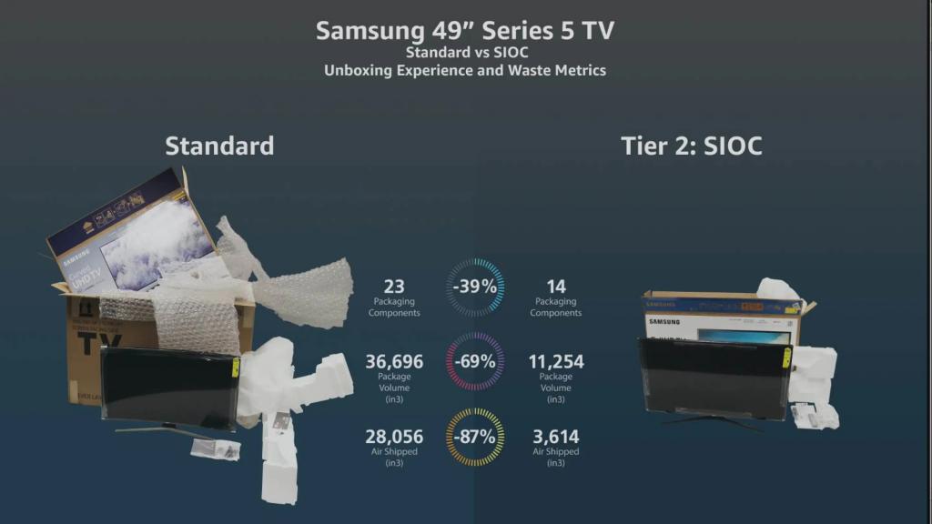 例如对于三星的一款电视,亚马逊为其减少了 9 个不必要的包装组件,使包装体积显着减少了 69%。与标准包装相比,直接减少了 87% 的空气运输。
