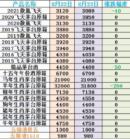 但事与愿违,最近一段时间,各类茅台酒的价格出现了松动的迹象。从回收商报价来看,2021散装飞天的价格降了40元/瓶、精品茅台降了50元/瓶、羊年生肖每箱降了200元。