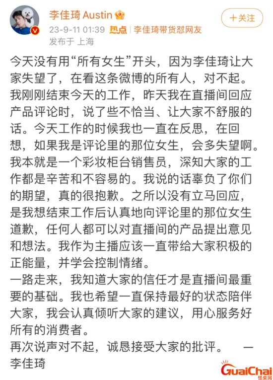 9月9日李佳琦怒怼消费者后,9月10日李佳琦在直播间,向网友就前一晚的言论道歉。随后11日凌晨李佳琦在微博发文字道歉,表示诚恳接受大家的批评。
