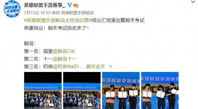 前段时间英雄联盟官方举办了手游解说培训营,一共有40几个人,其中还有许多LPL解说,他们本来就有解说经验,加上更加熟悉这款游戏,所以更容易被选中,这不,培训营前三名都是原来的LPL解说,猫皇获得第一名,十一第二名、奶弟第三名。
