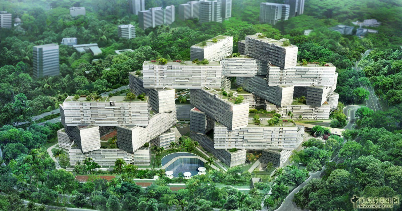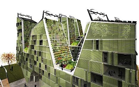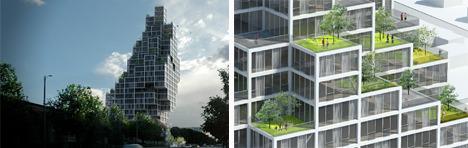 丹麦罗多弗雷自治市计划打造一种新型的居住城区,于是他们公开向所有建筑设计师发出了设计竞赛邀请。最终,荷兰MVRDV建筑设计事务所和丹麦ADEPT建筑设计事务所合作设计的“空中村庄”方案在竞赛中获胜。根据设计方案,“空中村庄”大厦将是一种多用途建筑,是一个集办公、居住、零售、生活等多种功能于一体的全新都市生活空间。整栋建筑将由一个个立方体形状的格栅组成,每个立方体格栅围绕建筑的中心主轴而灵活分布,可以根据需要进行调整。它看起来好像堆积起来的积木,设计师们将它形容为一个“垂直村庄”。在这种全新的未来派建筑上,分布着许多平台式的空中花园。这样,人们即使居住在摩天大厦中,也有机会欣赏美丽的花园和绿色的草坪。除了这些之外,“空中村庄”还有许多生态友好型设计,比如污水再利用系统、能源生产设备等,而且建造这种建筑的混凝土也是一种可再生物质。