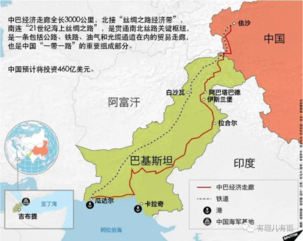 这条走廊,实际上是一条资源能源和商品的流通渠道,其中巴基斯坦的瓜达尔港和卡拉奇港连接阿拉伯海,是印度洋的一部分,地理位置和战略意义重大,特别是对于打通中国陆地运输线,摆脱海陆运输风险异常重要!