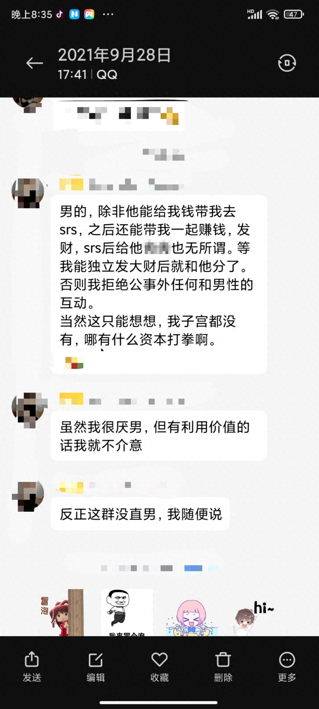 “只要这个问题不被解决,跨性别者面临的困境就永远不会有结果——即便SRS成功了又如何?变性手术后要重新办身份证,到时候此前个人取得的一切学位证、驾照都会被吊销,不再被承认,想要重新认证,又是新的麻烦。重生不等于被接纳。”有药娘在群里分享了这样的一段文字,可是群里正聊得火热,表情包一个接着一个,这段文字很快就被淹没了。