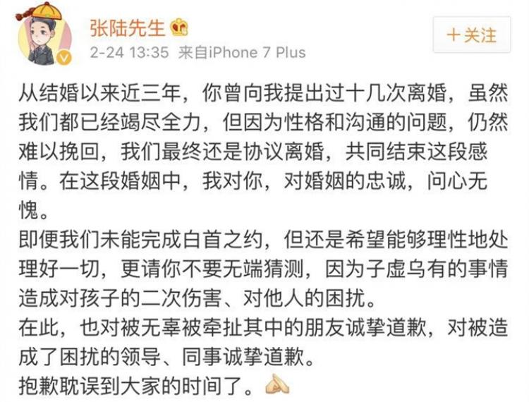 事情的真相如何已经不重要,没过多久,张陆就在某平台发文已与邵思涵离婚,并对曾伤害过的同事表示道歉,至于这个"小三"是谁,依旧是个迷。