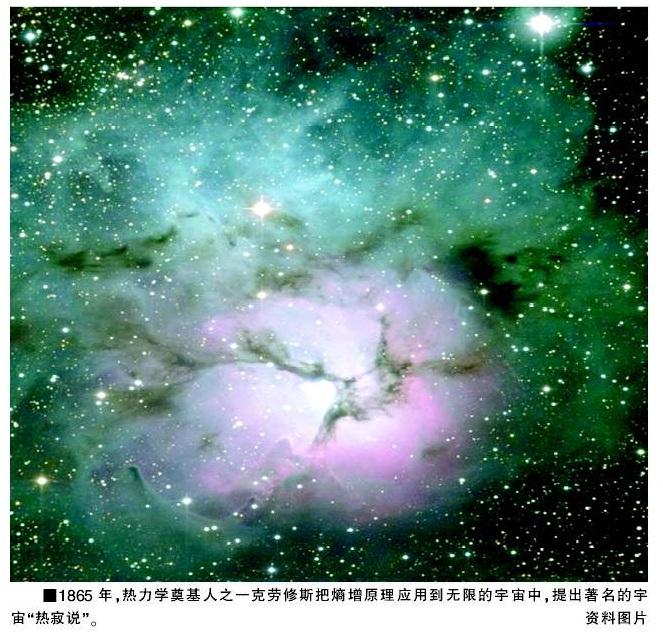 1865年,热力学奠基人之一克劳修斯把熵增原理(熵增原理是热力学第二定律的又一种表述)应用于无限宇宙中而提出“热寂说”,熵增原理就是孤立热力学系统的熵不减少,总是增大或者不变。用来给出一个孤立系统的演化方向。说明一个孤立系统不可能朝低熵的状态发展即不会变得有序。(孤立体系是指:系统与环境之间既无物质交换,又无能量交换,故称为孤立体系)