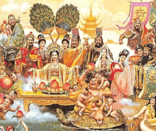 西王母:西王母同古人的阴阳交合观念有关。因为在殷墟甲骨文中曾经出现以“东母”、“西母”代指日月之神的用法,《穆天子传》曾经把奄山(即崦嵫山,日入之山)称为“西王母之山”,在汉代画像石中代表太阳的三足乌、九尾狐往往同西王母、东王公伴出,《神异经》也把昆仑记为西王母、东王公“阴阳相须”之处。