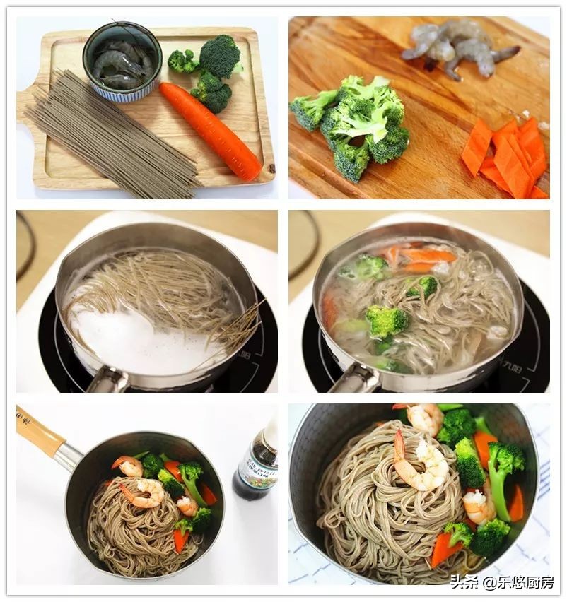 第一步:准备食材。荞麦挂面1小把、虾几个、西兰花适量、胡萝卜适量。