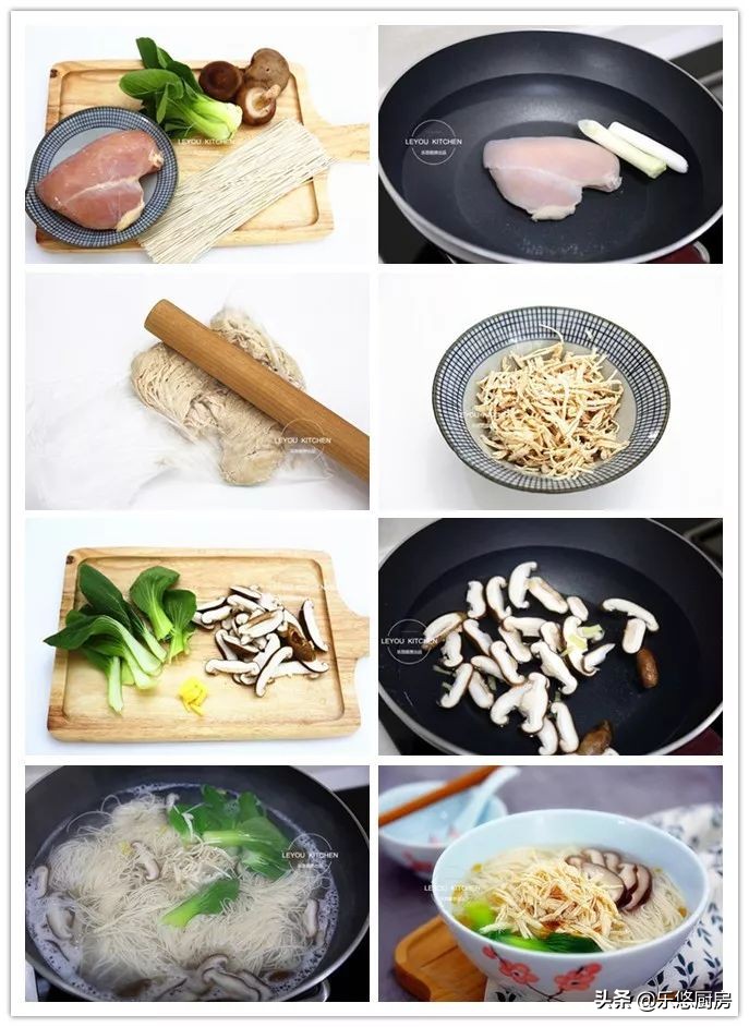 鸡肉与香菇,都属于比较鲜美的食材。用它们来煮挂面,汤鲜味美,面条滑溜,特别美味。