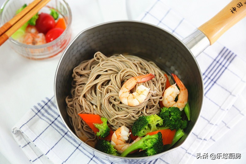 荞麦面,吃起来筋道爽滑,并有着荞麦特殊的香味,是减肥期间也可以放心吃的主食。再搭配鲜虾和各式蔬菜,清爽开胃,吃一口,更是鲜美。