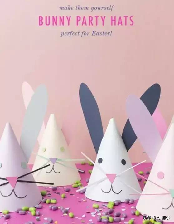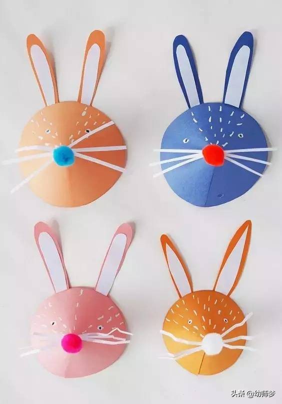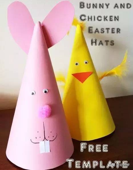 兔子耳朵用两个颜色卡纸来做,粘上鲜艳的棉花团。圆锥形做大一点,还可以当面具哦~