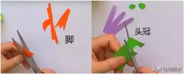 剪出2根长方形纸条、2个锯齿状梯形做脚掌,一个山字形、三个圆形卡纸做头冠~