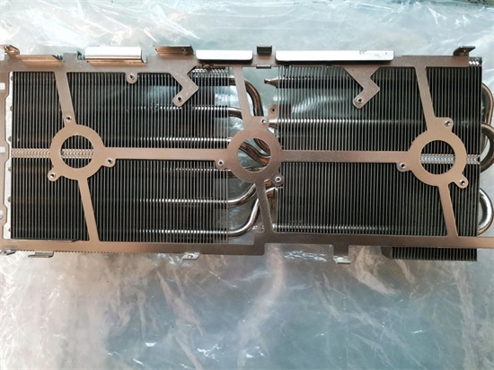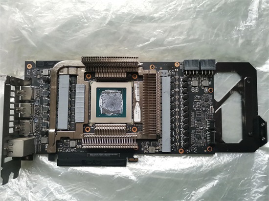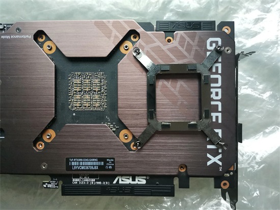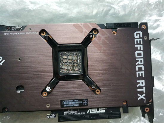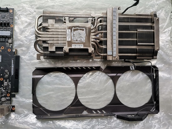 拆开后可以看见整个显卡的PCB,不过还没算拆完,除了显卡背板还有TUF的二段式散热片设计模块,6条6mm的纯铜镀镍热管采用回流焊的方式与散热鳍片连接在一起。