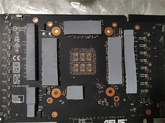 因为3090背面也有十二颗显存,所以同样也要贴。买的两片40*80mm的导热垫用来贴显存是绰绰有余,但是再加上电感就不够用了,所以将部分完整的导热垫又贴了回去。