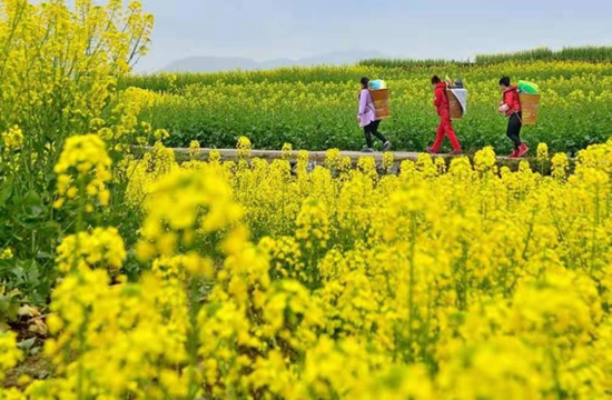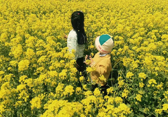 躬下身子仔细瞧,小小的四片花瓣黄黄的,对称着,像黄色蝴蝶的翅膀在飞翔。这份美好让我突然想起,宋代诗人杨万里的《宿新市徐公店》:“篱落疏疏一径深,树头花落未成阴。儿童急走追黄蝶,飞入菜花无处寻。”不过眼下之景,非诗人笔下的篱笆小院,而是:接天黄花无穷丽,伴日春光别样情。那蕊儿也是黄黄的,这黄色不完全是那种耀眼的金黄,而是黄色中略带有绿的痕迹。毕竟,扎进大地怀抱的绿色油菜花杆儿,有着强大的生命遗传“基因”。小花们你挤我、我挤你,一大簇一大簇,被颀长的杆儿举在最高处,你瞅我我瞅你,生动的笑开了脸。让你不忍心去摘它,就这么静静地和它对望,已然是十二分的美好!又怎能为了一己之私而去破坏,她们对大自然的拥抱,和对我们人的友好?!