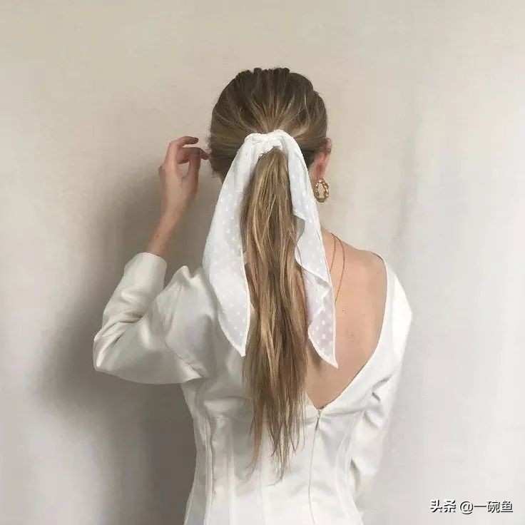 低马尾的丝巾编发,就是直接用一根丝巾绑在头发上,一秒就能get简约大方。