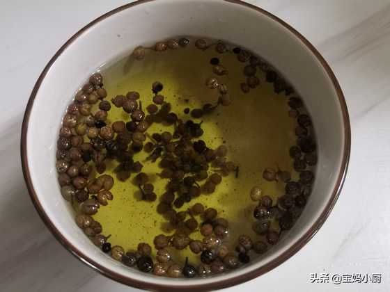 第二步,花椒2勺放入小碗里,加入200毫升的热水浸泡出花椒的味道,直到颜色变深,花椒水味道浓郁。