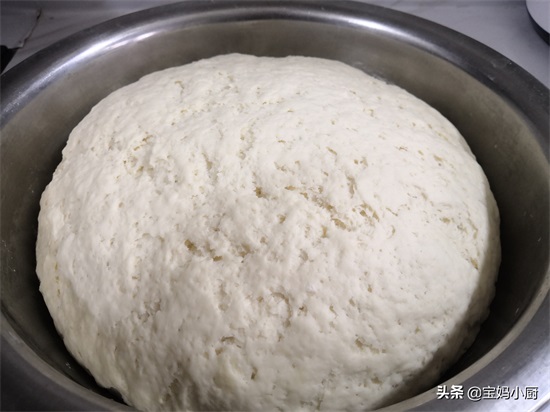 第十步,做包子。这是发酵到两倍大的面团。面粉用了1500克,干酵母用了15克,用温水把酵母化开,再拌入面粉里,分次加水拌面絮,揉成光面团,盖上盖子发酵。夏天这个季节发面很快,一个小时左右就搞定
