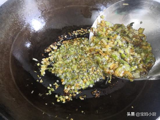 第四步,铁锅烧热,加入花生油1.5饭勺,放入1/3的葱花,小火炸
