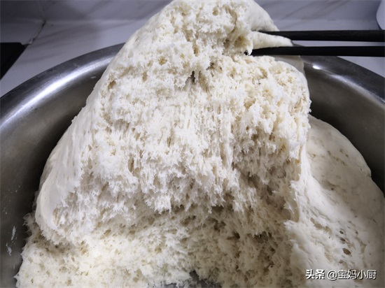 第十一步,发好的面团拉开看一下,都是大蜂窝,手感变轻
