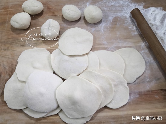 第十二步,面团揉一揉,做剂子,每个剂子用擀面杖擀一圈就可以,包子皮需要中间厚四周略薄的厚面皮,这样做出来的包子才有长个空间,吃着更暄乎