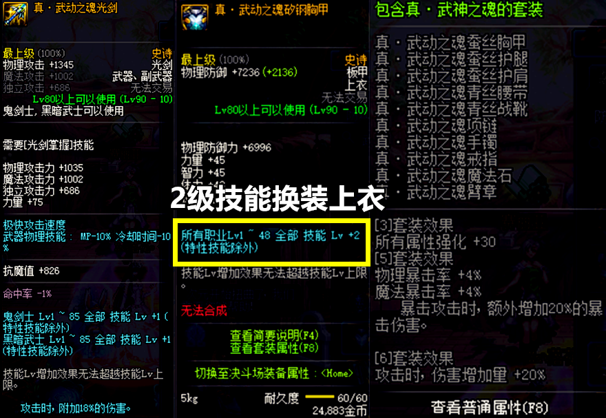 其中真·武动之魂系列史诗上衣Lv1~48技能+2,相比传说武动之魂上衣要好很多,因为传说级别的武动之魂上衣是Lv20~48技能+2,这让buff技能在Lv20级以下的玩家非常苦恼。