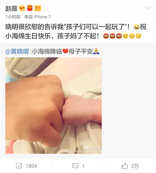 黄晓明的老同学赵薇,也发微博表示:“晓明很欣慰的告诉我‘孩子们可以一起玩了’!祝小海绵生日快乐,孩子妈了不起!”