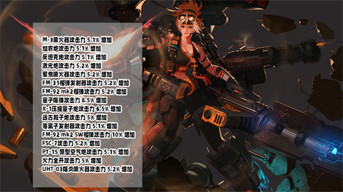 M-3喷火器攻击力提升5.1%加农炮攻击力提升5.1%反坦克炮攻击力提升5.1%激光炮攻击力提升5.2%聚焦喷火器攻击力提升5.2%FM-31榴弹发射器攻击力提升5.2%FM-92 mk2榴弹攻击力提升5.2%量子爆弹攻击力提升8.5%X-1压缩量子炮攻击力提升6.5%远古粒子炮攻击力提升5%等离子发射器攻击力提升5.1%FM-92 mk2 SW榴弹攻击力提升10%FSC-7攻击力提升5.2%PT-15 原型空气炮攻击力提升5.1%火力全开攻击力提升5%UHT-03爆炎喷火器攻击力提升5.2%