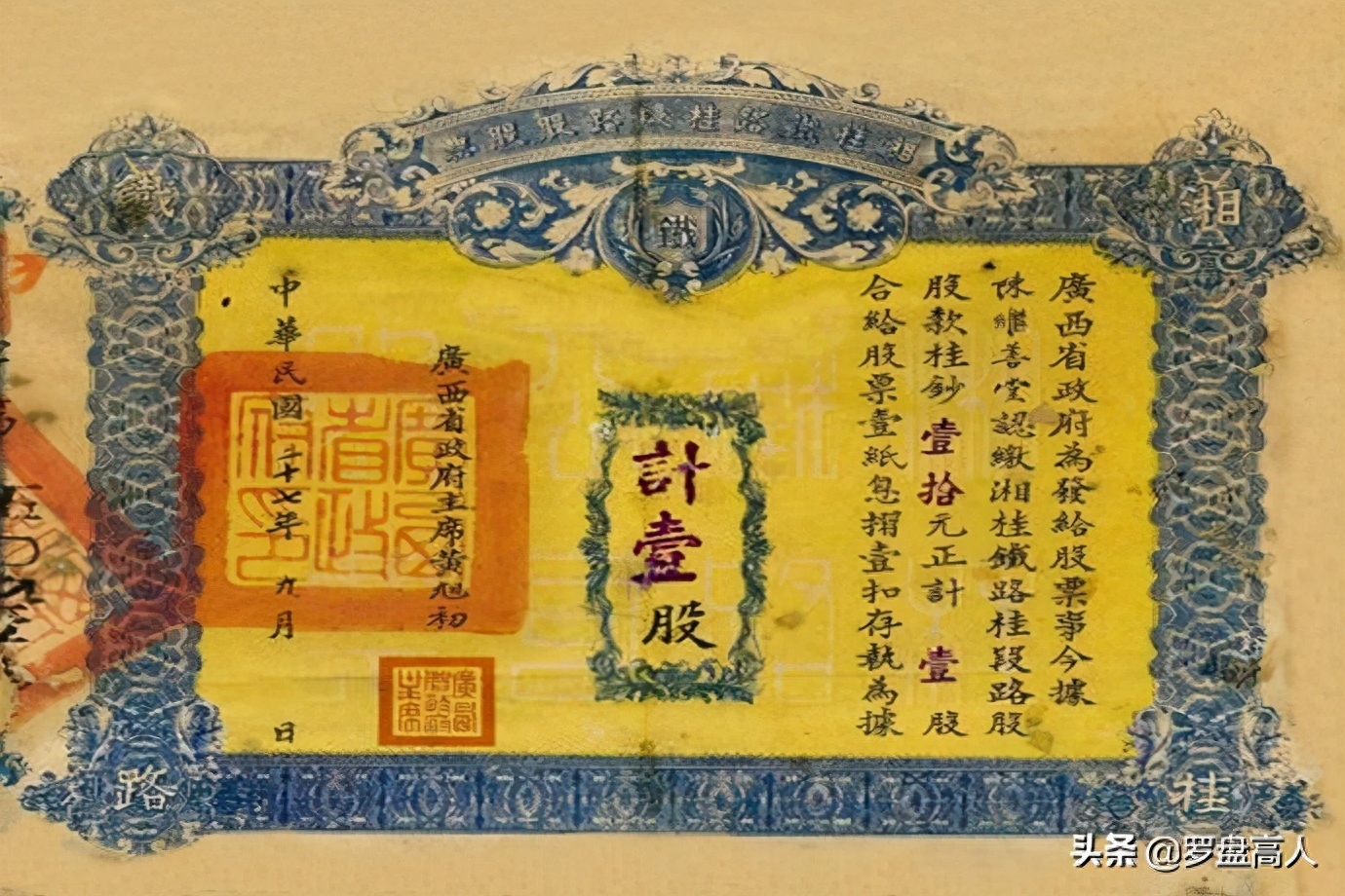 1938年,湘桂铁路开始发行桂段路股股票,壹股计桂钞壹拾元,由广西省政府主席黄旭初签署发行。