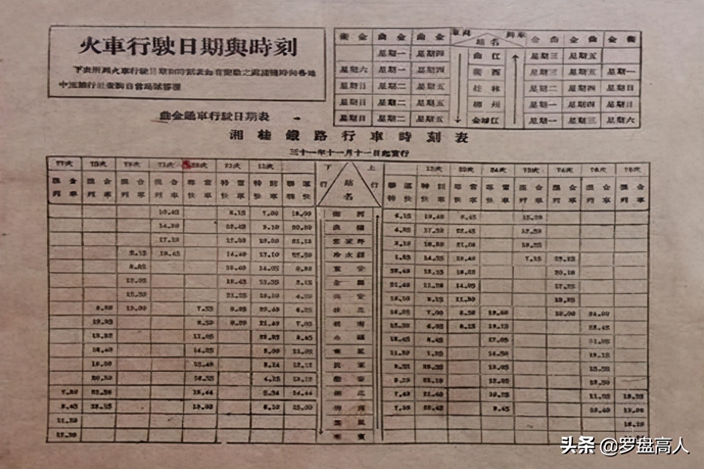 1942年,曲金通车行驶日期表和湘桂铁路行车的时刻表。