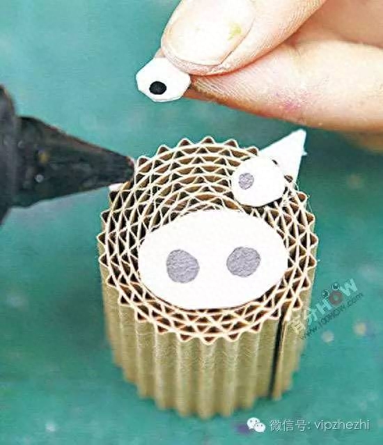 1,将瓦楞纸按长边方向裁成5厘米宽的长条型,再卷成圆柱形,末端接缝时用热胶枪粘合,这个要作为小猪的身体。